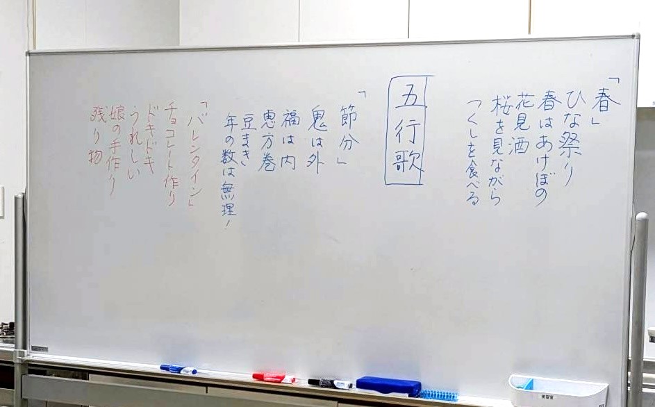 「季語も字数も制限のない詩です。」と簡単な説明のあと、まずはお題を考えていただきました。3グループから出たお題はこの季節ならではのもの。そのお題に沿った気持ちや連想する言葉を一人一行ずつ言っていき、五行で1つの詩にします。