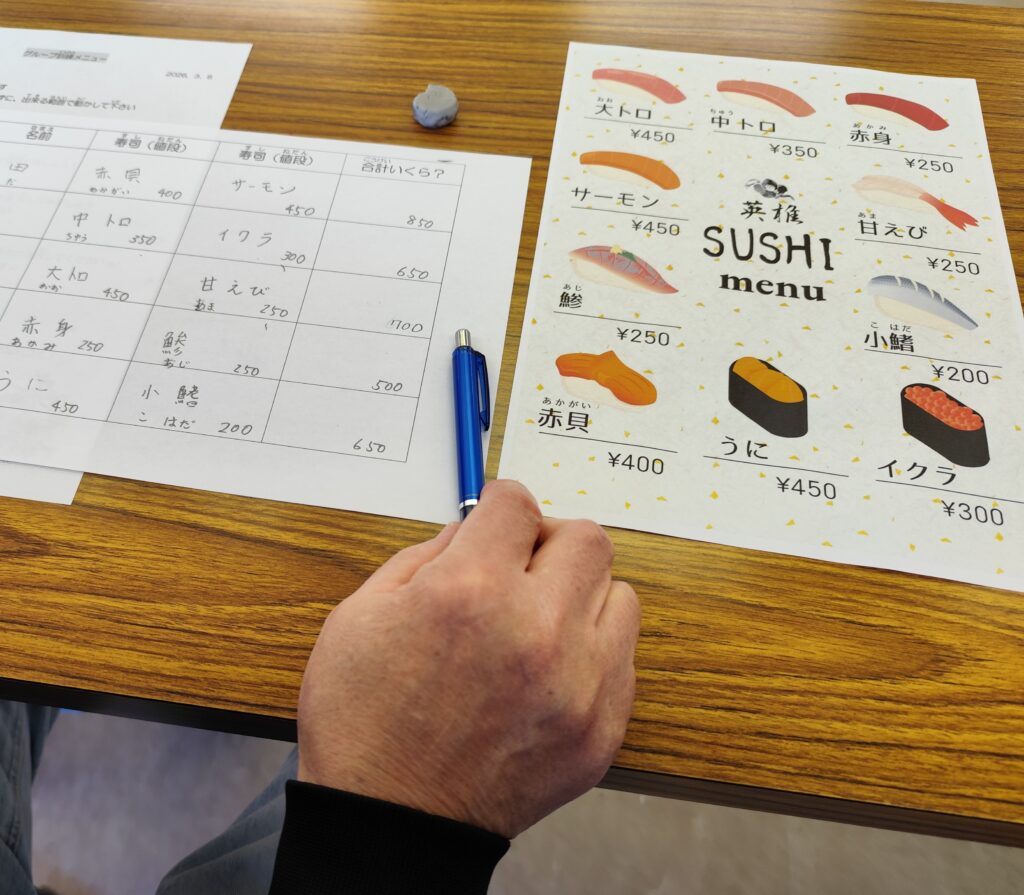最初は歌に合わせて、手の甲に乗せたお手玉をポンポンと上げ下げしました。次に、お寿司のメニューを見て、自分が食べたい物と値段を注文書に書き、合計金額を計算しました。