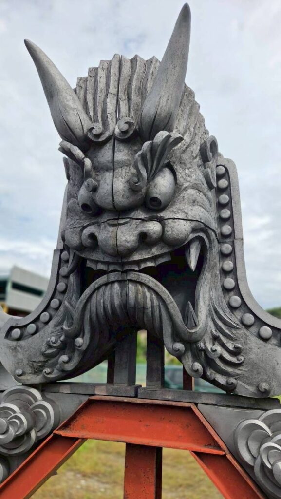 かわら美術館正面玄関前には、いぶし瓦で作られた巨大鯱が1対展示されていました。その大きさに感嘆しながら、先ずは記念撮影。瓦に関する常設展のほかに、7/26~見学当日の10/19まで開催されていた「トキントキンの時代」という企画展を見る事ができました。