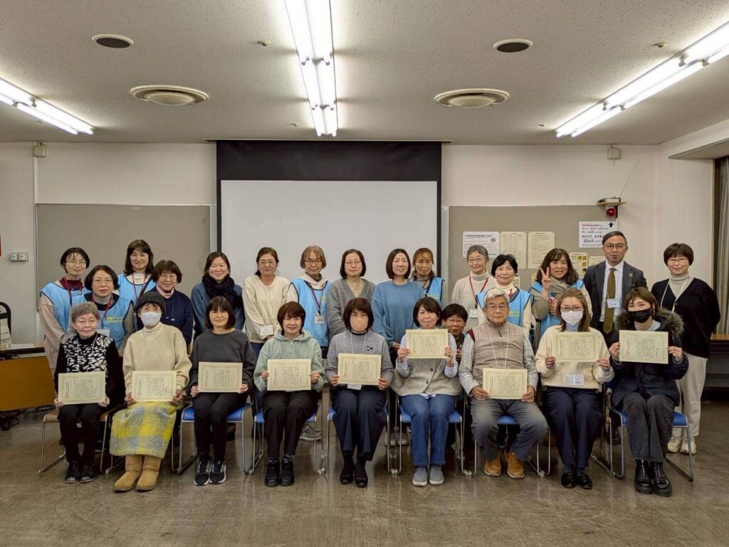 2025年10月から始まりました5回の講座は2026年1月10日に最終回を終え9名の方が修了証を手にされました。(ご都合で1回欠席しても修了できません。)3か月間「失語症について」「失語症の方の支援について」学ばれた16名の受講生さんたちに敬意を表します。今期はNPOあなたの声の失語症会話パートナーとして6名の方をお迎えしました。講座に協力・応援くださった言語聴覚士や失語症のある方々にお礼申し上げます。